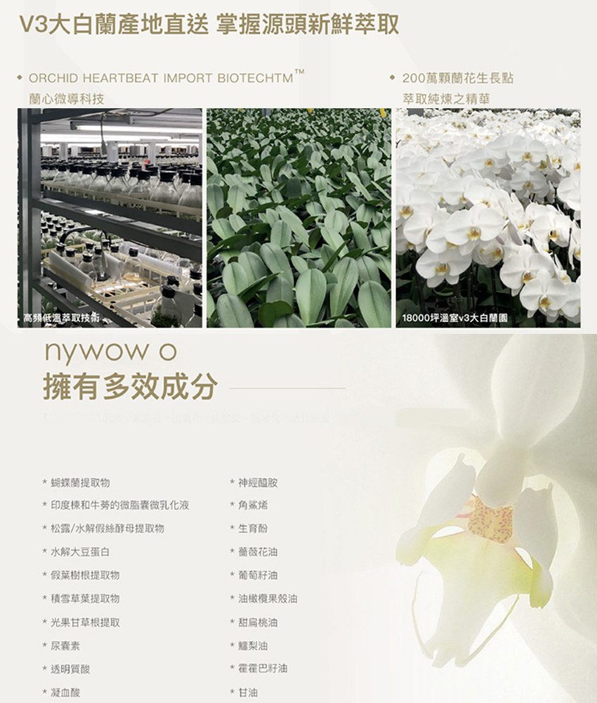 nywow o V3大白蘭蘭胚生長點精萃成份是蘭花油美麗奇蹟,精萃蘭花芽胚細胞,富含多酚、多黃酮、多醣的蘭花花莖葉為原料